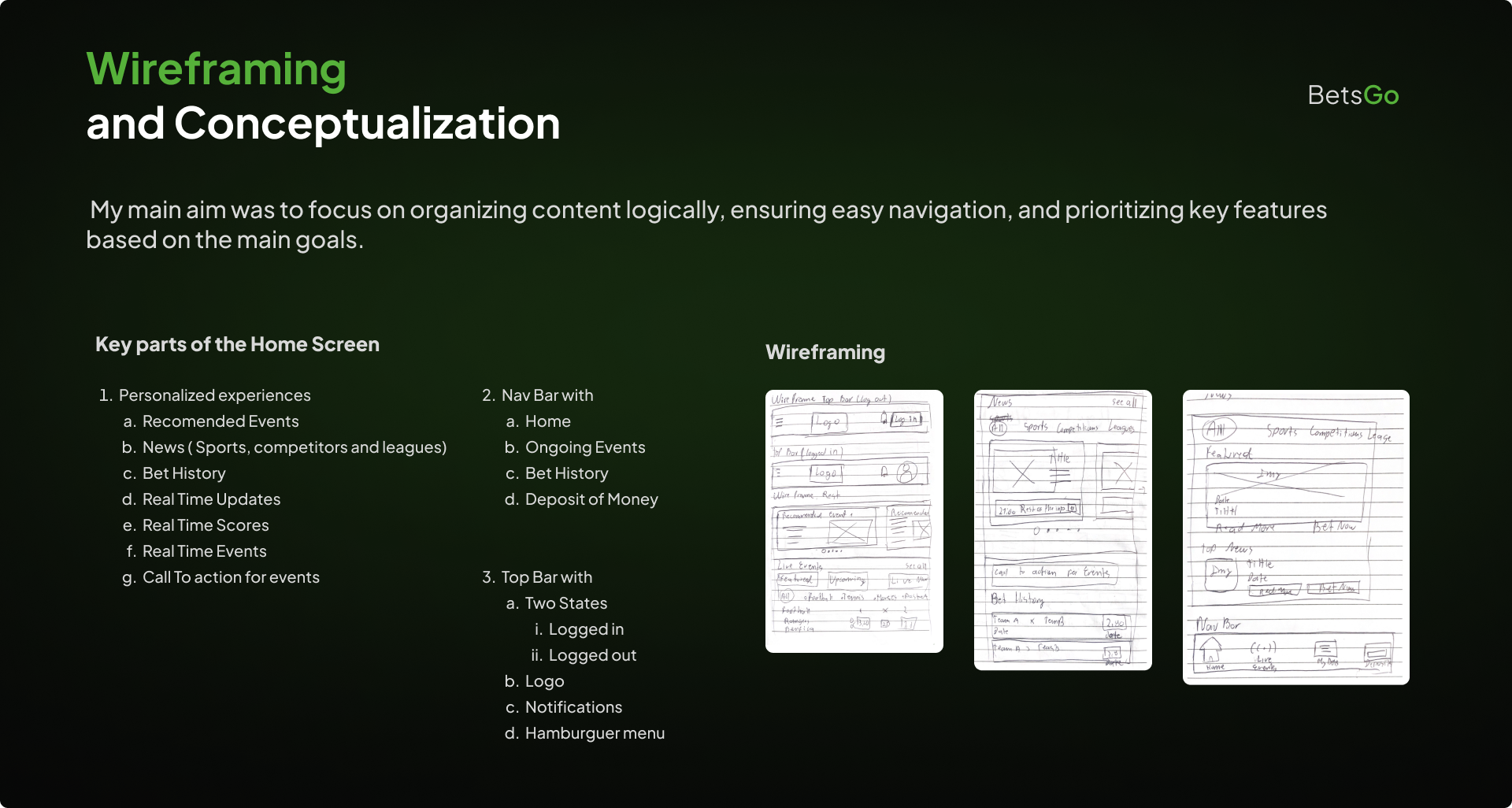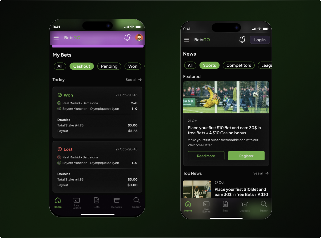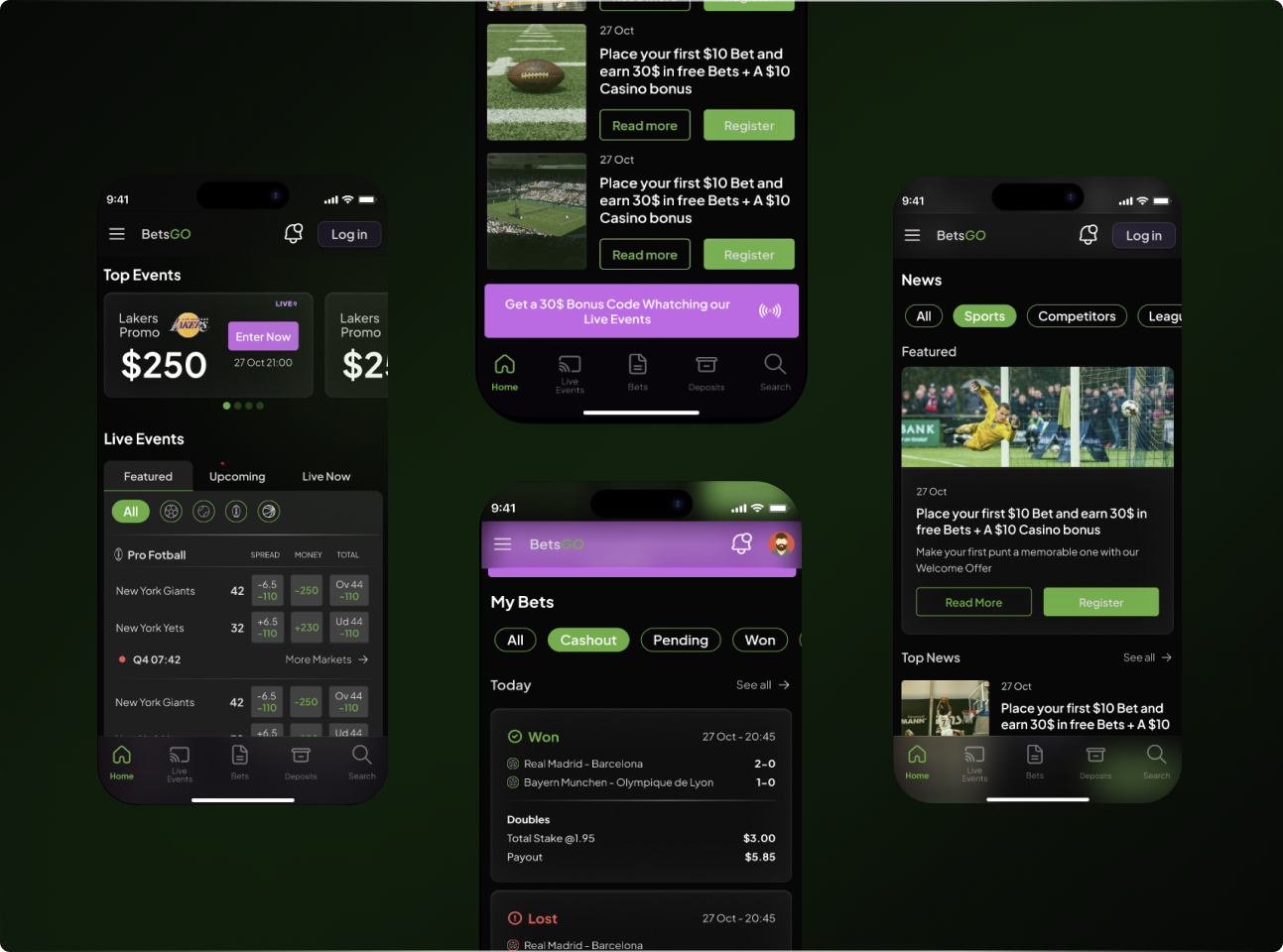 BetsGO is a comprehensive UI/UX concept for a sports betting mobile application, specifically optimized for the iOS ecosystem. The primary objective of this project was to declutter the typically overwhelming betting interface and replace it with a user-centric, personalized dashboard.