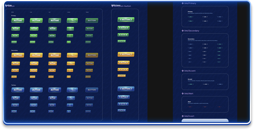 I also rapidly adjusted the design system to support a “Gamification-First” B2B use case, identifying three primary experiences: Curiosity (interactive game guides), Social (high-fidelity badges and animations for VIP level-ups), and Efficiency (centralized atomic components enabling fast deployment of localized skins).
