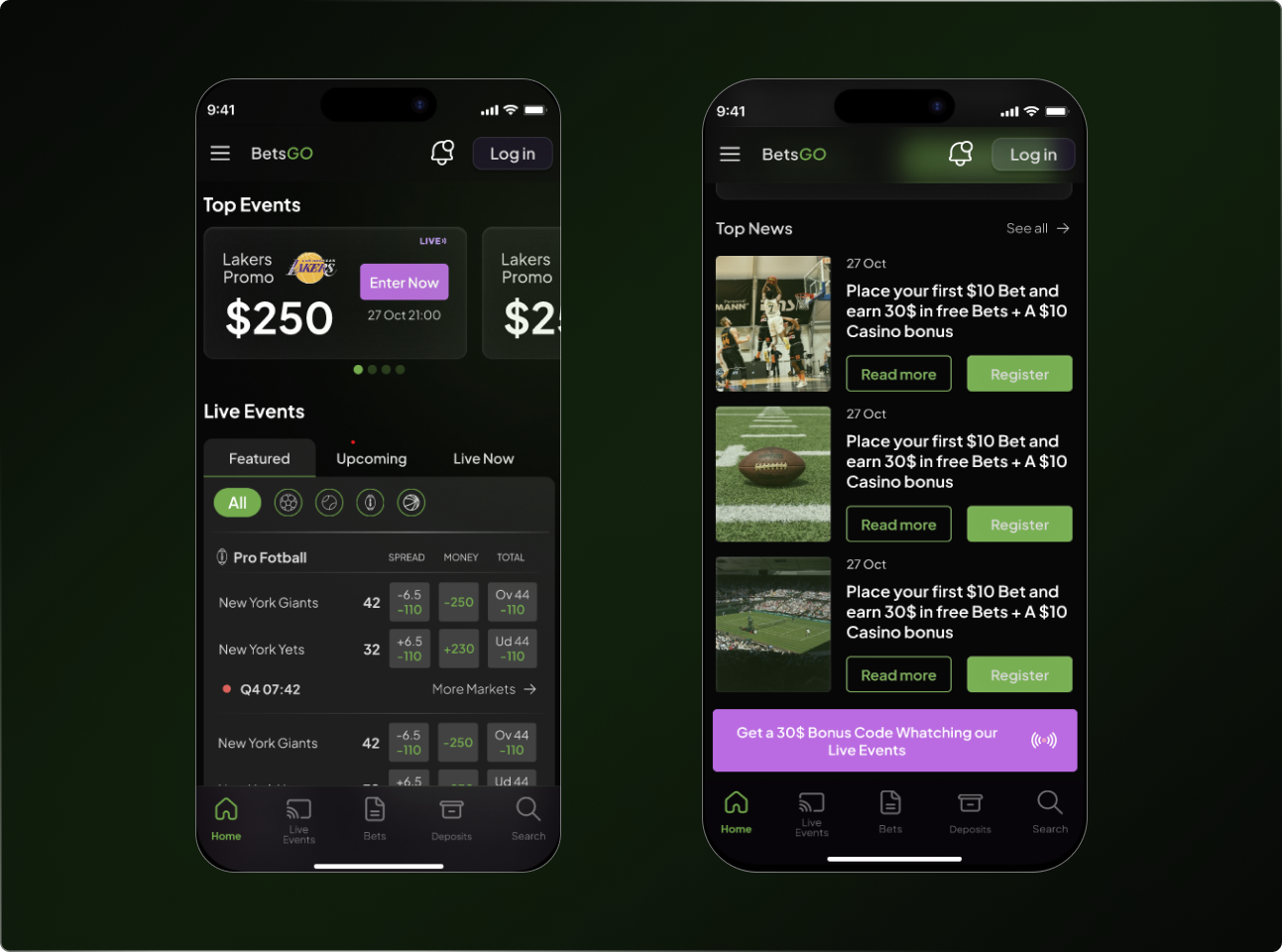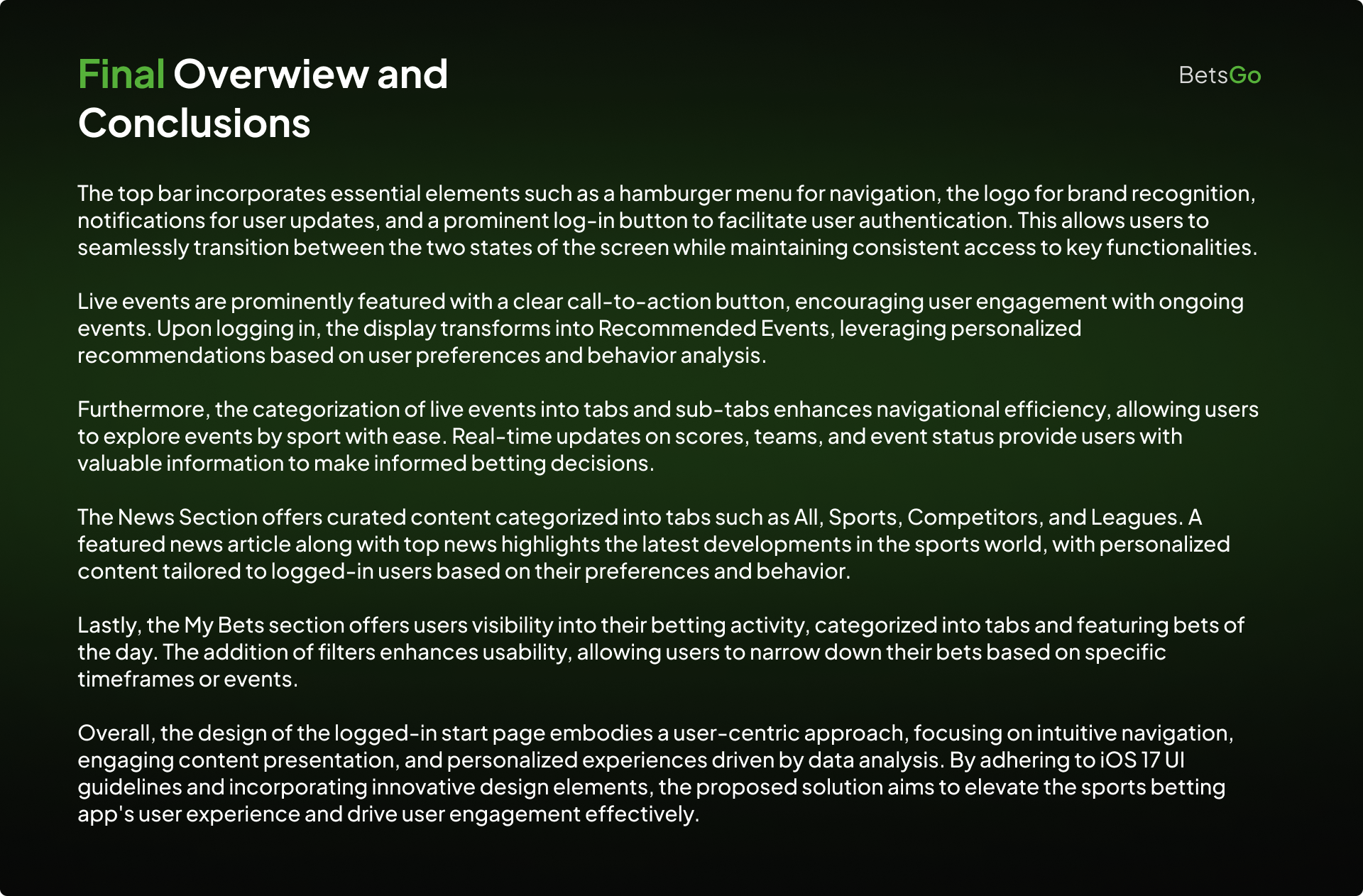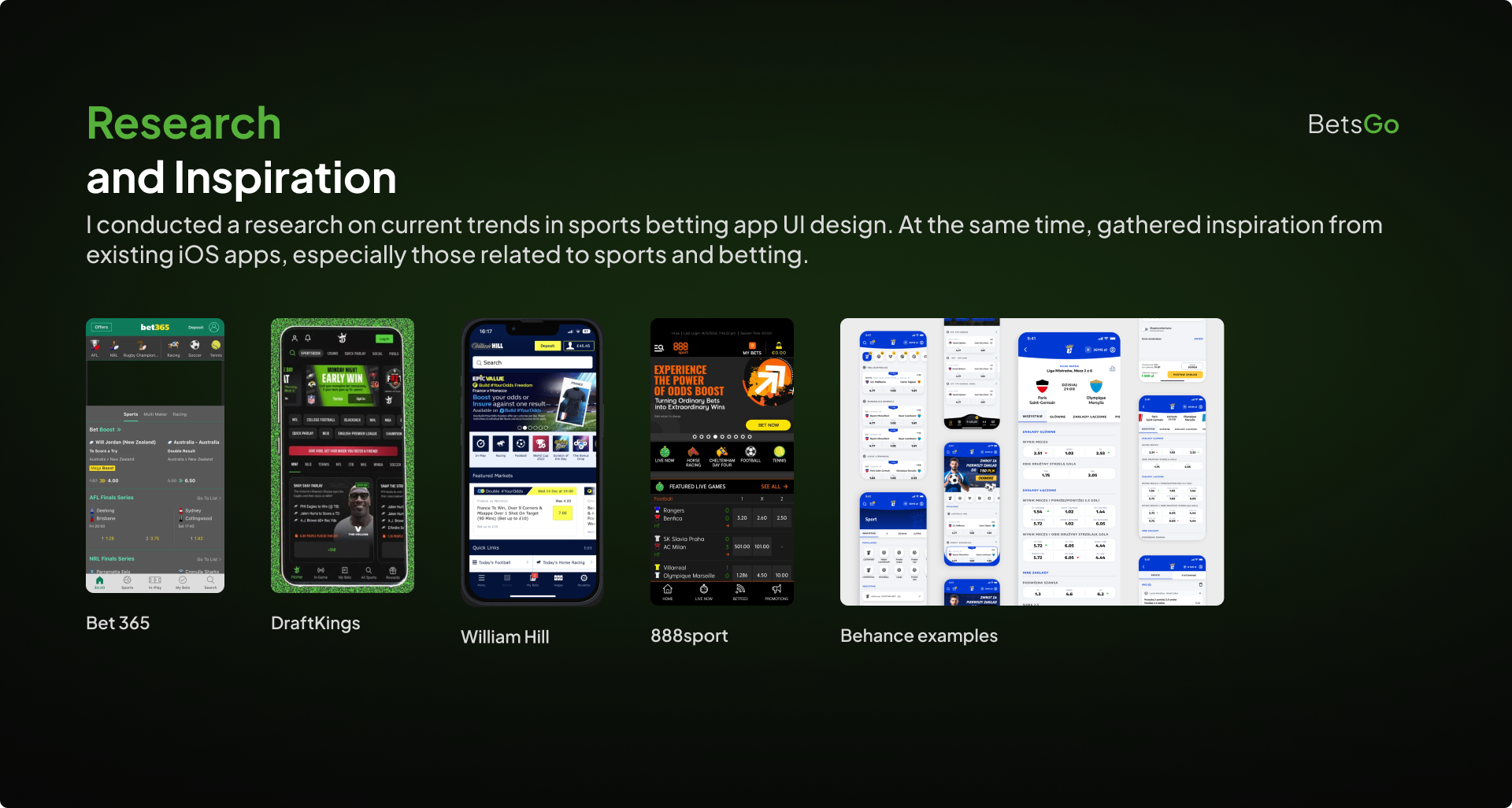 BetsGO is a comprehensive UI/UX concept for a sports betting mobile application, specifically optimized for the iOS ecosystem. The primary objective of this project was to declutter the typically overwhelming betting interface and replace it with a user-centric, personalized dashboard.