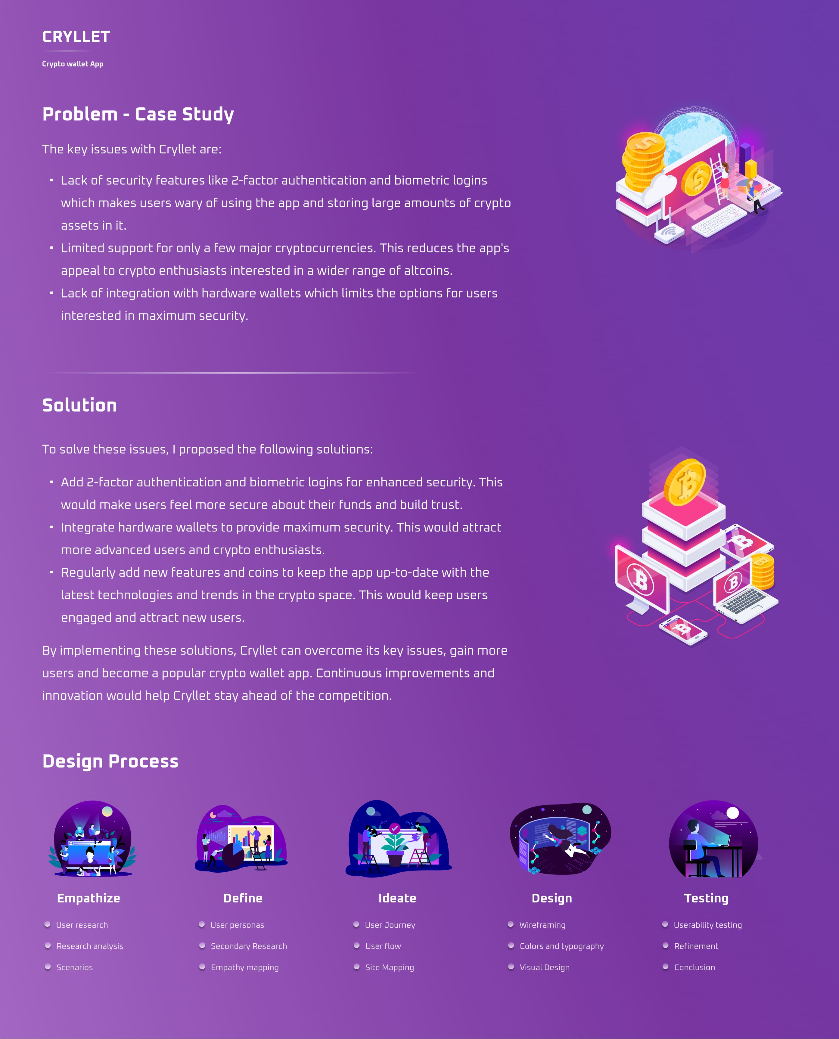 Cryllet is a conceptual Crypto wallet app that I designed using Figma. The app is a modern crypto wallet for all the users that would like to exchange, buy, send or receive all the types of crypto currencies. The main feature of the app is to use all the method of interaction, with all the safe warranties. Every user can transfer and exchange cryptocurrencies and exploring new features.